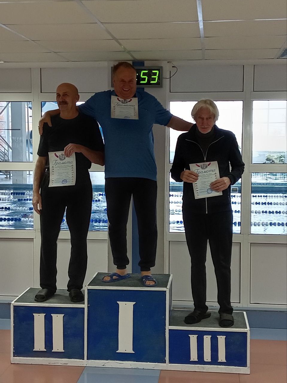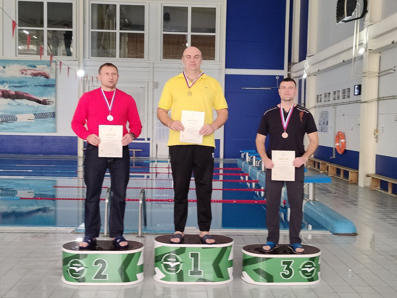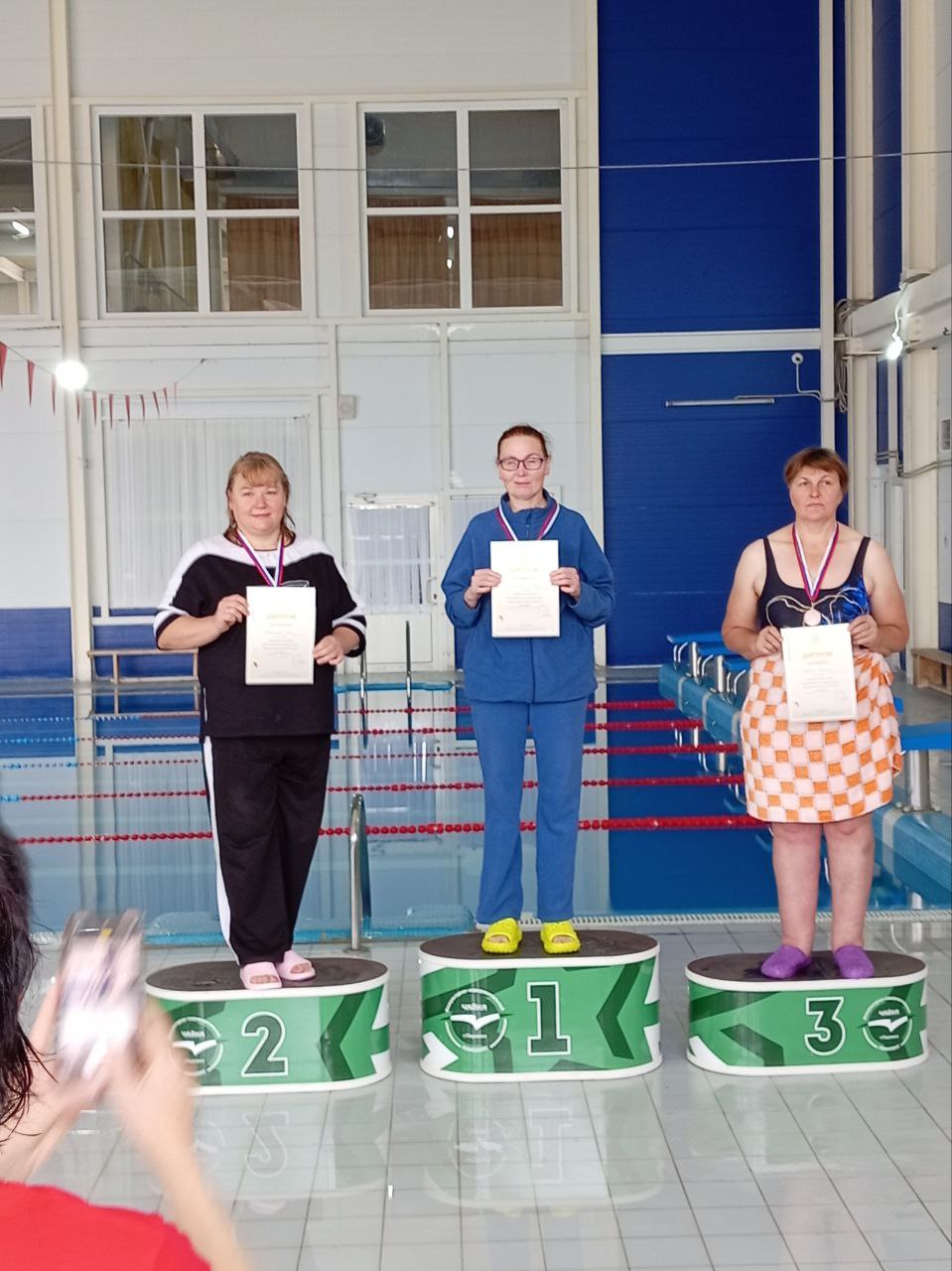 В ФОКе "Волга" г. о Воротынец 17.10.25г прошли соревнования по плаванию приуроченные к Декада пенсионеров. В соревнованиях принимали участия пенсионеры Спасского м. о и Воротынского м.о. В увлекательной эстафете наша команда поднялась на верхнюю ступень пьедестала почёта завоевала золотые медали: Прилепа Сергей Леонидович, Гарсия Елена Ивановна, Евдокимовым Иван Петрович, Рыкованова Ольга Анатольевна, Пономаревой Татьяна Степановна. В личном зачёте на дистанции 25 метров (муж) Прилепа Сергей Леонидович занял 1 место, среди (жён) Фатурова Антонина Ивановна 3 место, Пономаревой Татьяна Степановна 2 место. Соревнования прошли в дружеской обстановке, все получили заряд бодрости и хорошее настроение. |